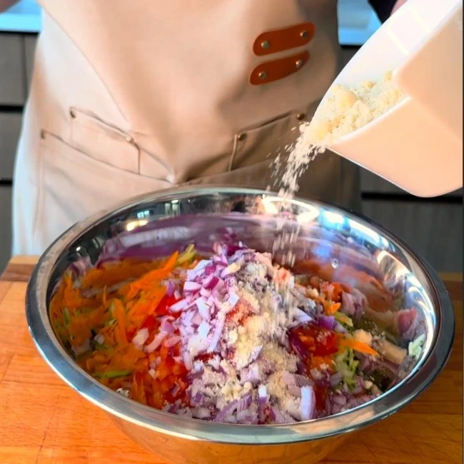 A zöldségeket tisztítsa meg, majd reszelje le. A lereszelt zöldségeket keverje össze egy tálban az apróra vágott salottával, fokhagymával és fűszernövényekkel. Ízesítse sóval és borssal. Adjon hozzá annyi diólisztet, hogy a massza könnyen formázható legyen, de ne essen szét.